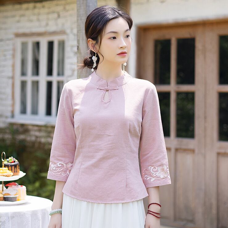 チャイナトップス 普段着 七分袖 単色 民族衣装風 zt360