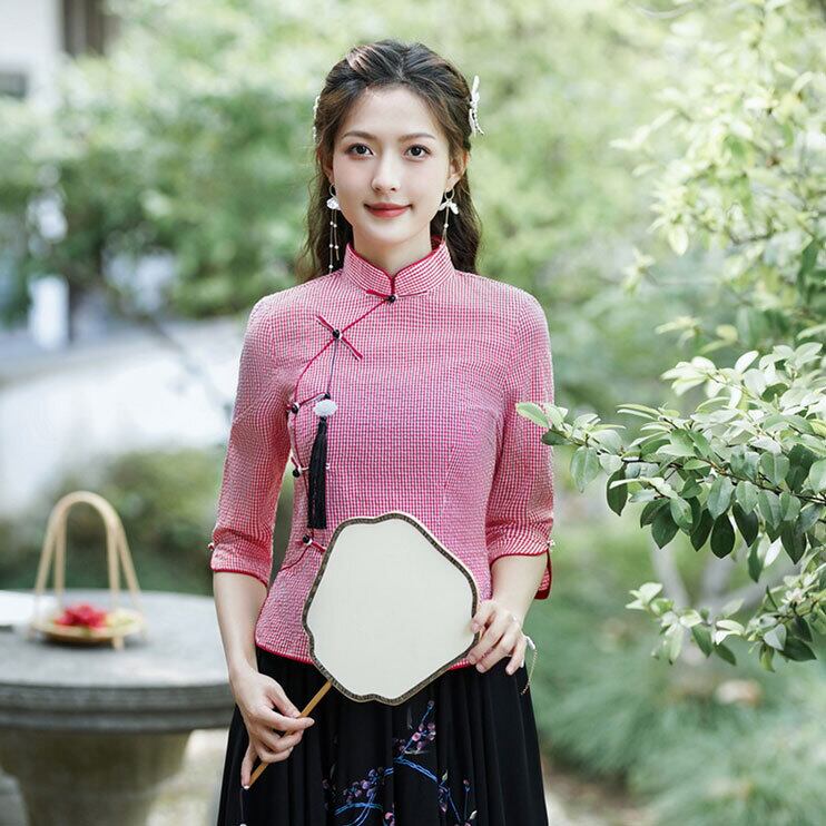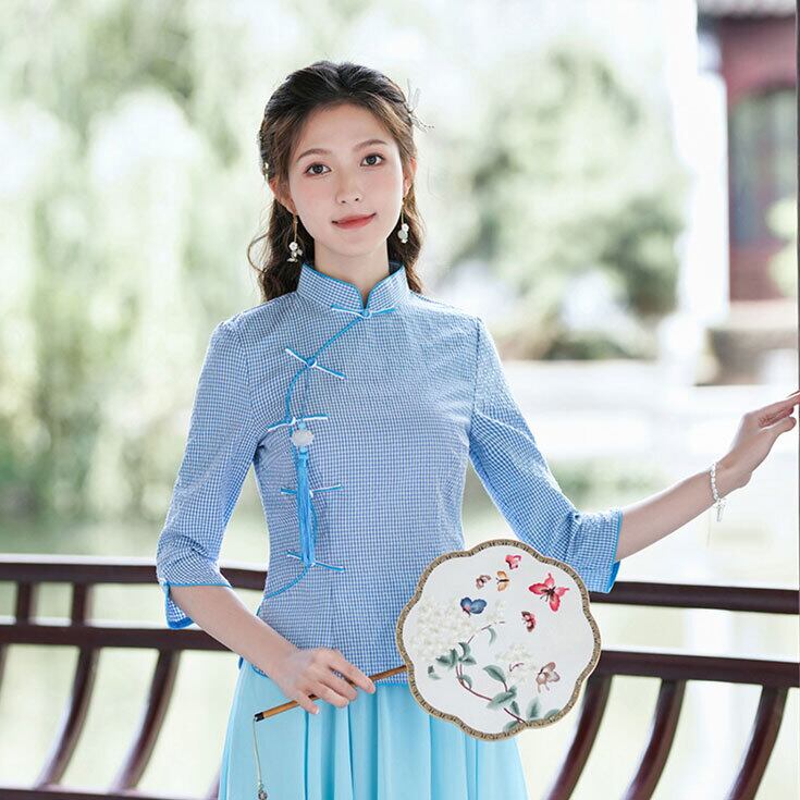 チャイナトップス 普段着 小さなチェック柄 落ち着いた風合い 茶師服 zt365