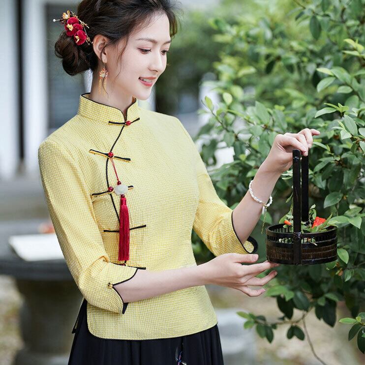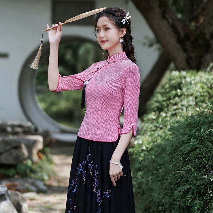 トップスも普段着も揃うチャイナ服専門店chaiです。こちらはチャイナトップス 普段着 チェック柄 落ち着いた風合い 茶師服 zt365の商品ページです。小さなチェック柄が素敵なチャイナトップスで、落ち着いた風合いが人気のアイテムです。