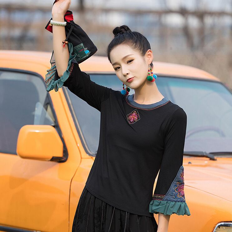 チャイナ服 トップス 刺繍 フリルスリーブ 七分袖 ロンT zt372