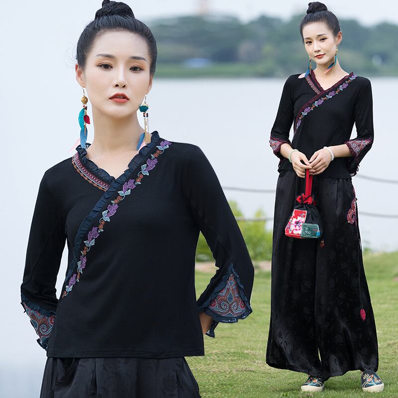 チャイナ服 トップス 刺繍 フリルスリーブ 七分袖 ネック zt373