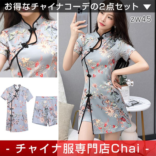 トップスも普段着も揃うチャイナ服専門店chaiです。こちらはチャイナ服 セットアップ ロングトップス ショートパンツ 2点セット zw45の商品ページです。花柄が素敵なロングトップスとショートパンツの2点セットで、店舗のユニフォームなどにも選ばれているアイテムです。