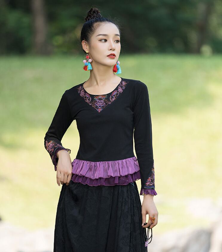 トップスも普段着も揃うチャイナ服専門店chaiです。こちらはチャイナ服 トップス 長袖 刺繍 カットソー zt379の商品ページです。刺繍の装飾の凝ったチャイナトップスで、普段着だけでなく二胡の演奏会や舞踏の衣装など幅広く使いやすいアイテムです。