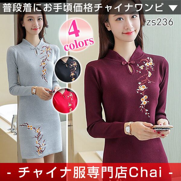 トップスも普段着も揃うチャイナ服専門店chaiです。こちらはチャイナドレス チャイナ服 ワンピース 暖か ニット 刺繍 zs236の商品ページです。ニット生地の可愛いチャイナドレスで、秋冬のチャイナファッションにちょうどよいアイテムです。