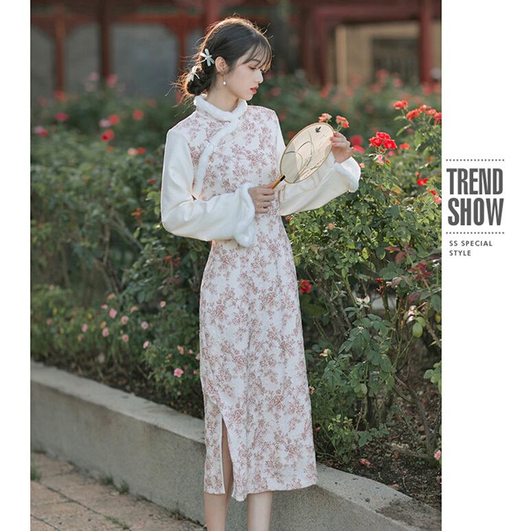 チャイナドレス ロングワンピ ファー フェミニン 暖か 花柄 zl318