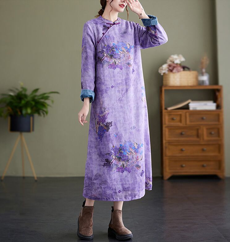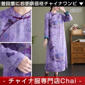 チャイナ服 普段着 ロングワンピ 暖か裏地 素朴な風合い パープル 秋冬 ゆったり zl337
