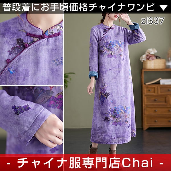 トップスも普段着も揃うチャイナ服専門店chaiです。こちらはチャイナ服 普段着 ロングワンピ 暖か裏地 素朴な風合い パープル 秋冬 ゆったり zl337の商品ページです。裏地の暖かいロングチャイナワンピで、素朴な風合いが素敵な秋冬の普段着チャイナファッションにちょうどよいアイテムです。