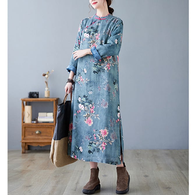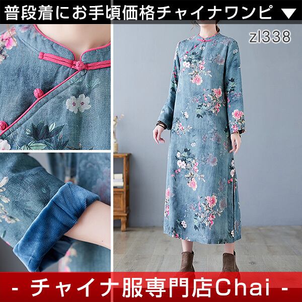 トップスも普段着も揃うチャイナ服専門店chaiです。こちらはチャイナ服 普段着 ロングワンピ 暖か裏地 花柄 素朴な風合い 秋冬 ゆったり zl338の商品ページです。裏地の暖かいロングチャイナワンピで、素朴な風合いが素敵な秋冬の普段着チャイナファッションにちょうどよいアイテムです。