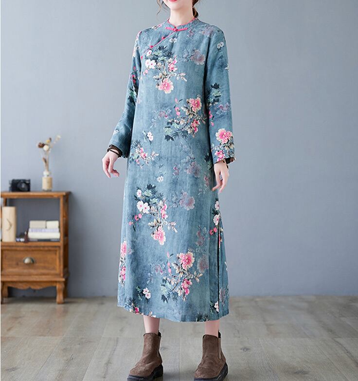 チャイナ服 普段着 ロングワンピ 暖か裏地 花柄 素朴な風合い 秋冬 ゆったり zl338