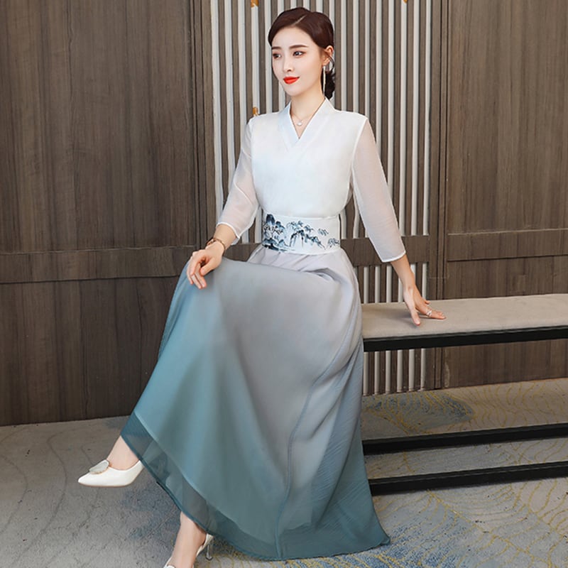 トップスも普段着も揃うチャイナ服専門店chaiです。こちらはチャイナドレス ロングワンピ 春夏 上品な風合い 秋冬 七分袖 グラデーション zl339の商品ページです。上品な風合いのロングチャイナワンピで、春夏のチャイナファッションにおすすめのアイテムです。