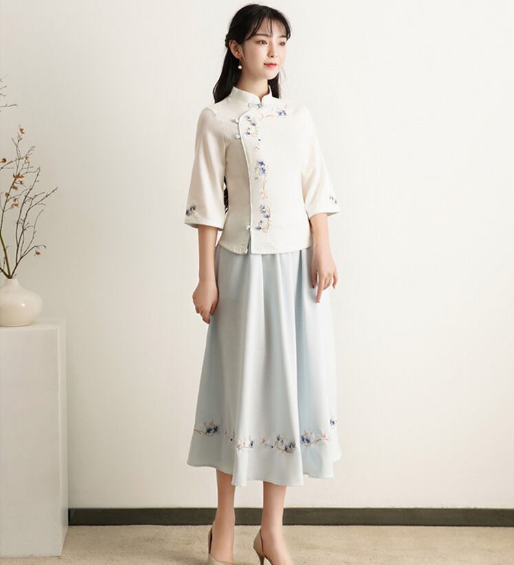 チャイナ服 小花柄刺繍スカート Aライン 普段着チャイナ zq84
