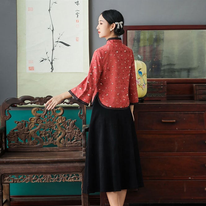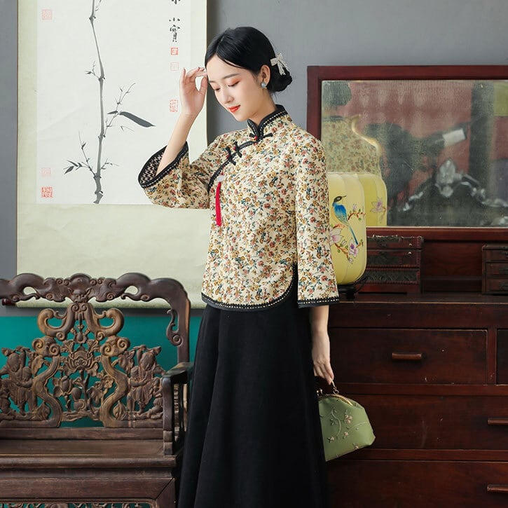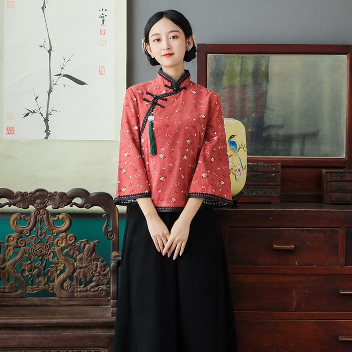 チャイナ服 トップス 素朴な風合い 春秋 七分袖 小花柄 チャイナトップス zt438