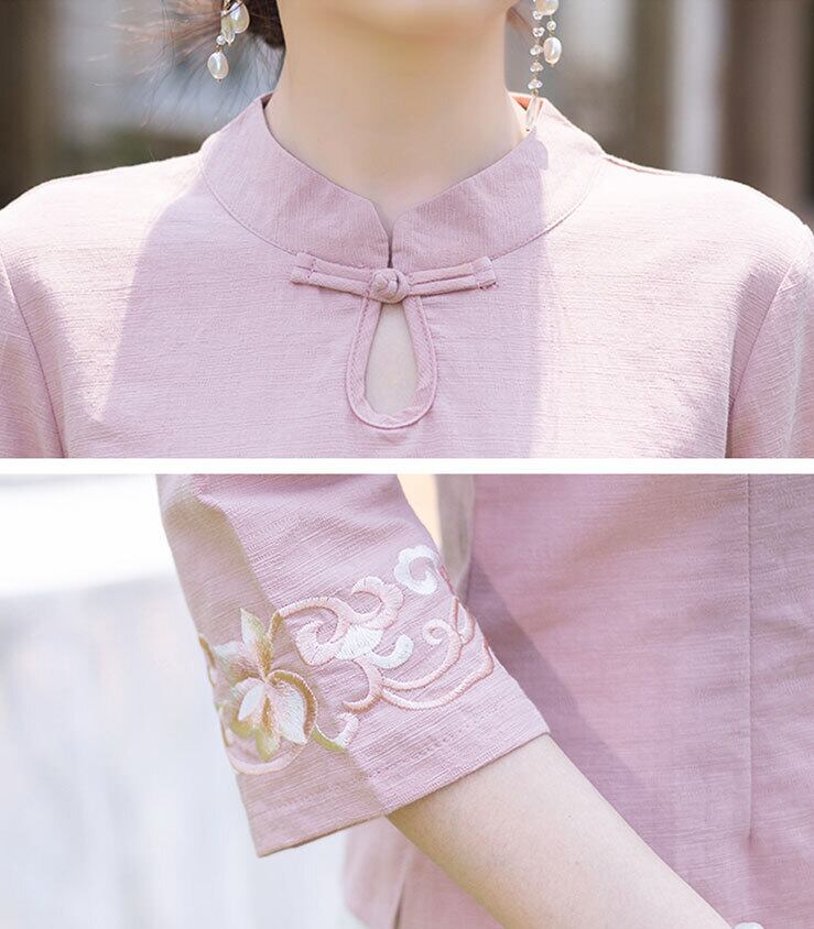 チャイナ服 トップス 春夏 爽やかな風合い 刺繍 七分袖 二胡衣装 中国茶 禅 zh394