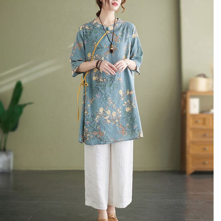 チャイナ服 トップス 素朴な風合い 春秋 半袖 ロング丈 ゆったりシルエット 普段着チャイナ zh401