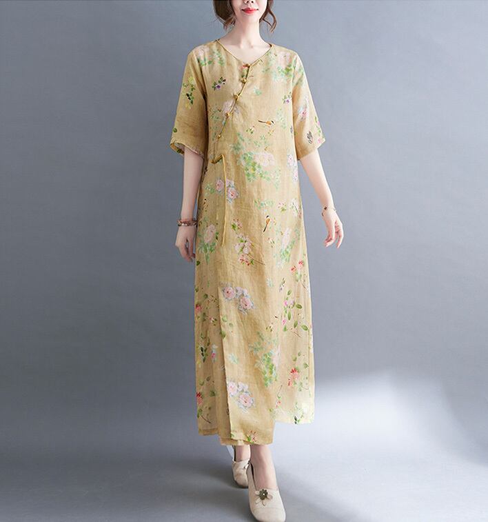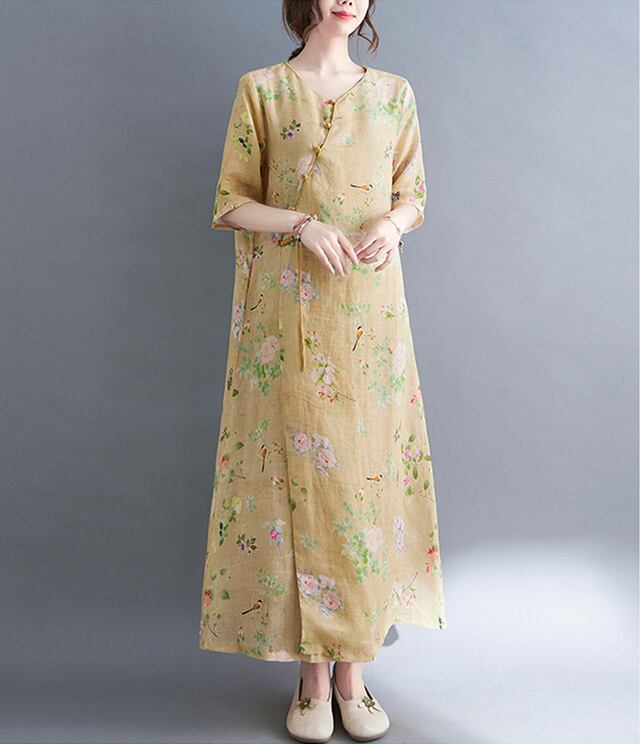 チャイナ服 ワンピース 春夏 落ち着いた風合い 素朴 五分袖 薄手 zl344