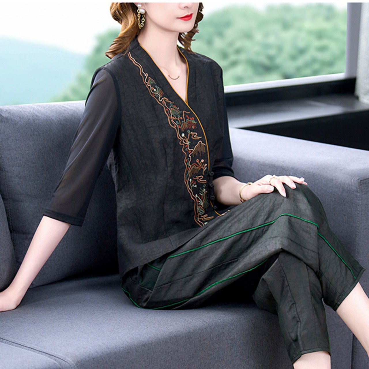 チャイナ服 トップス 春夏 刺繍 落ち着いた雅な風合い ゆったりシルエット 七分袖 zh407