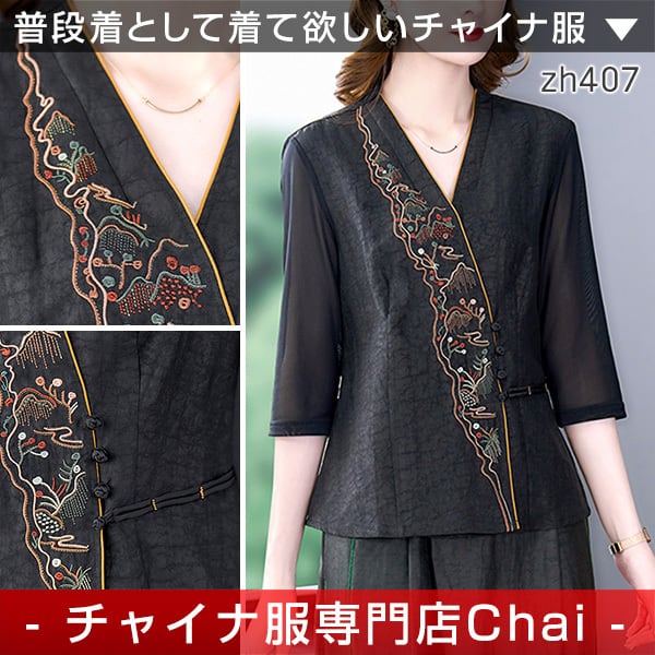トップスも普段着も揃うチャイナ服専門店chaiです。こちらはチャイナ服 トップス 春夏 刺繍 落ち着いた雅な風合い ゆったりシルエット 七分袖 zh407の商品ページです。刺繍の素敵な民族風柄のトップスで、春夏のチャイナファッションに取り入れても良く合うアイテムです。