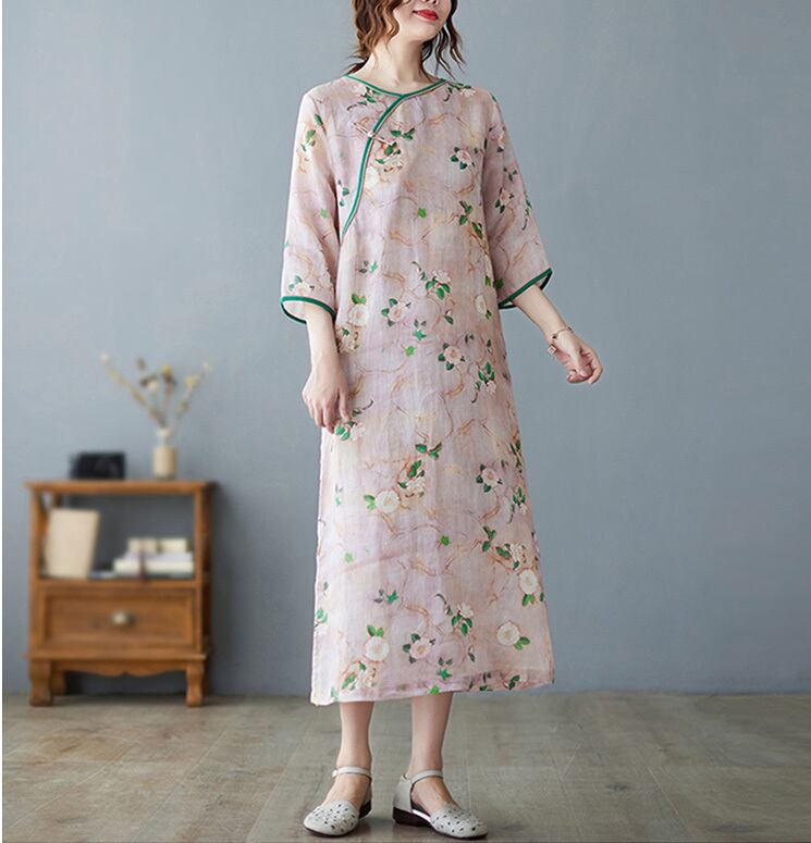 チャイナ服 ワンピース 春夏 花柄 落ち着いた風合い 素朴 五分袖 薄手 zl349