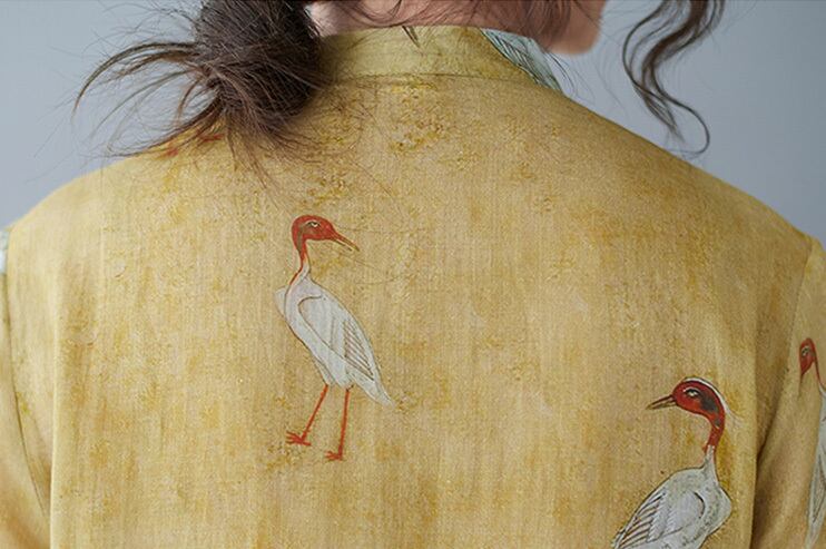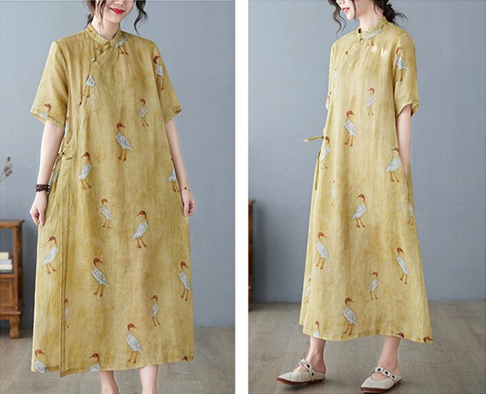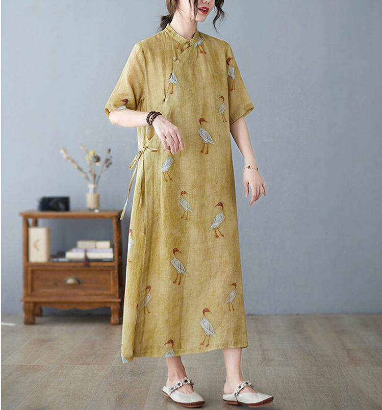 チャイナ服 ワンピース 春夏 鶴柄 素朴な風合い 斜め合わせ 五分袖 薄手 zl350
