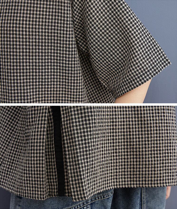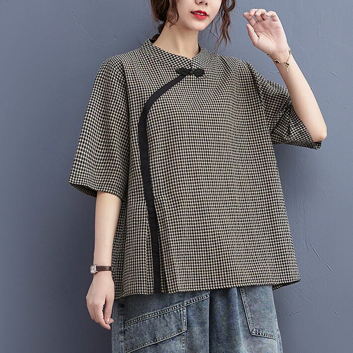 トップスも普段着も揃うチャイナ服専門店chaiです。こちらはチャイナ服 トップス 普段着 チェック柄 カジュアルチャイナT ゆったり zh415の商品ページです。ゆったりシルエットのチェック柄チャイナトップスで、春夏のチャイナファッションにぴったりのアイテムです。