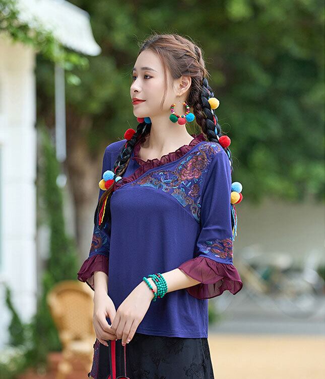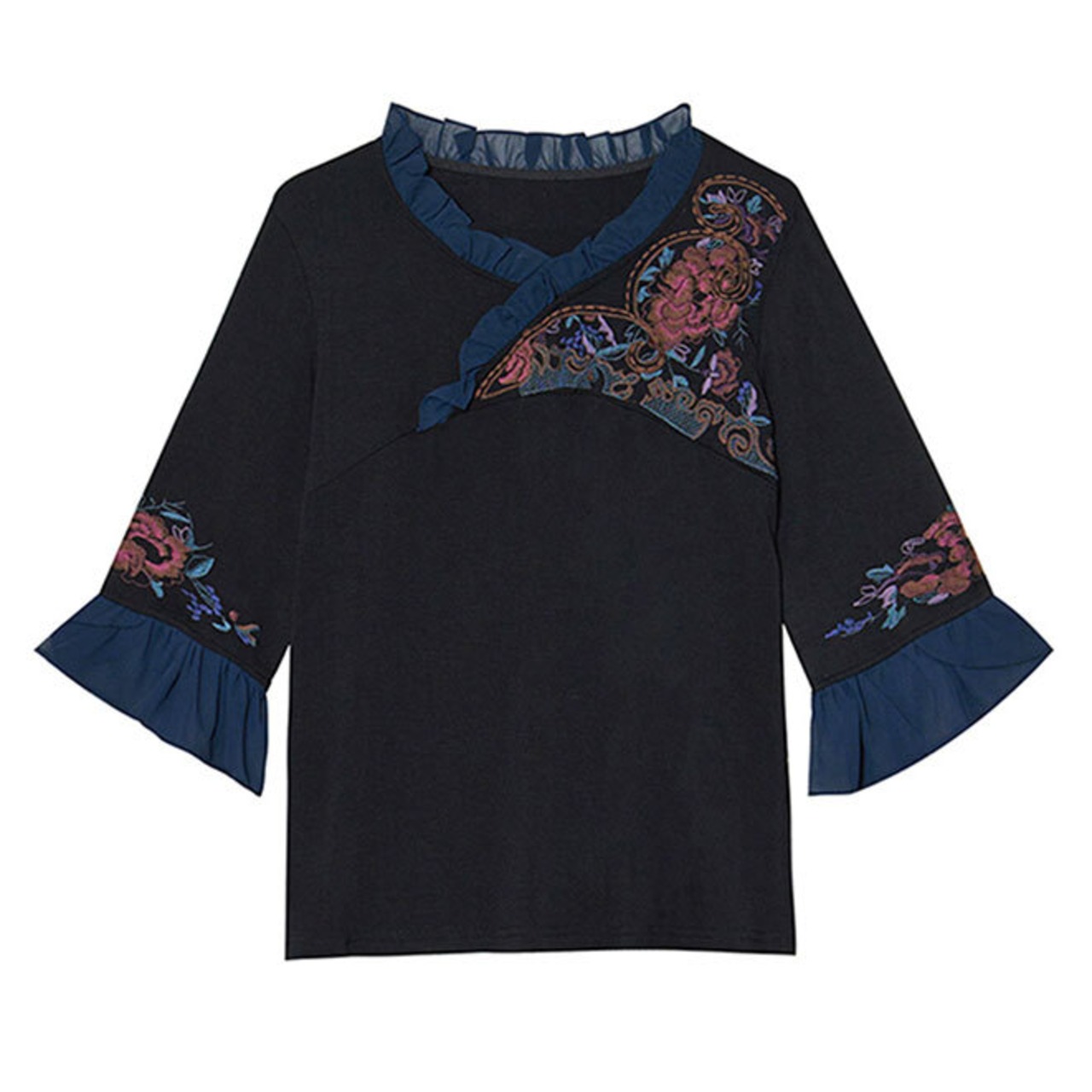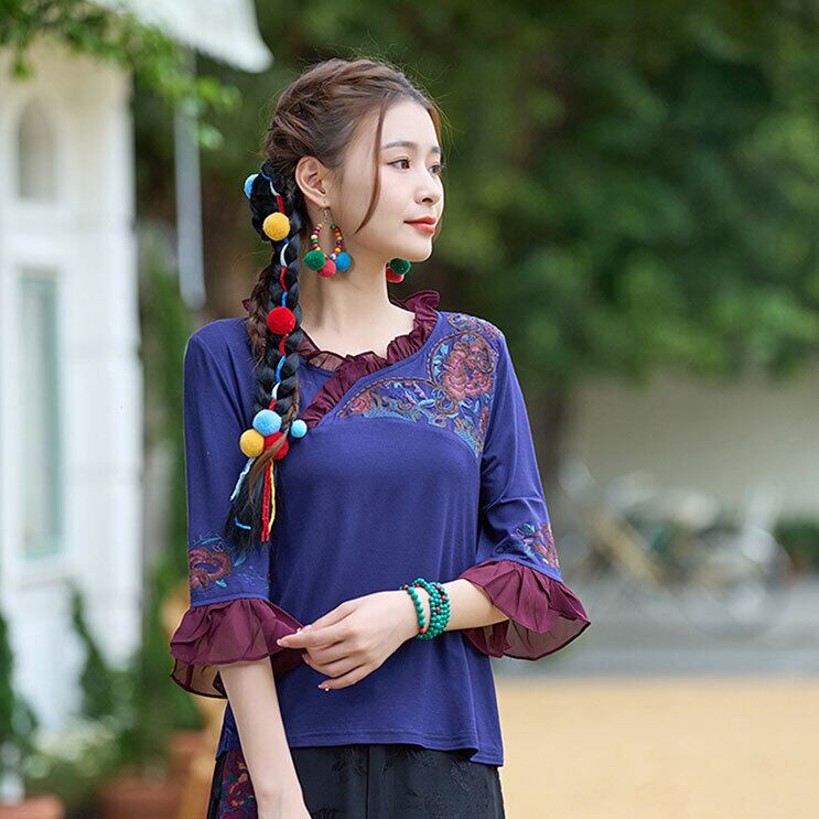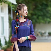 チャイナ服 トップス 七分フリル袖 刺繍 チャイナシャツ zt447