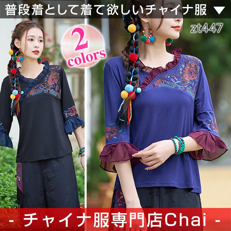 トップスも普段着も揃うチャイナ服専門店chaiです。こちらはチャイナ服 トップス 七分フリル袖 刺繍 チャイナシャツ zt447の商品ページです。フリル袖と刺繍が素敵な民族衣装風トップスで、チャイナファッションにぴったりのアイテムです。