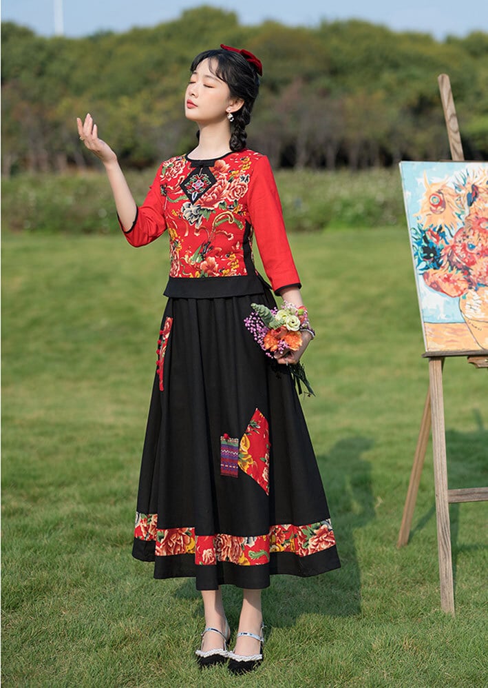 チャイナ服 上下セット 春夏 七分袖トップス ロングスカート 2点セット 華やかな風合い zw53