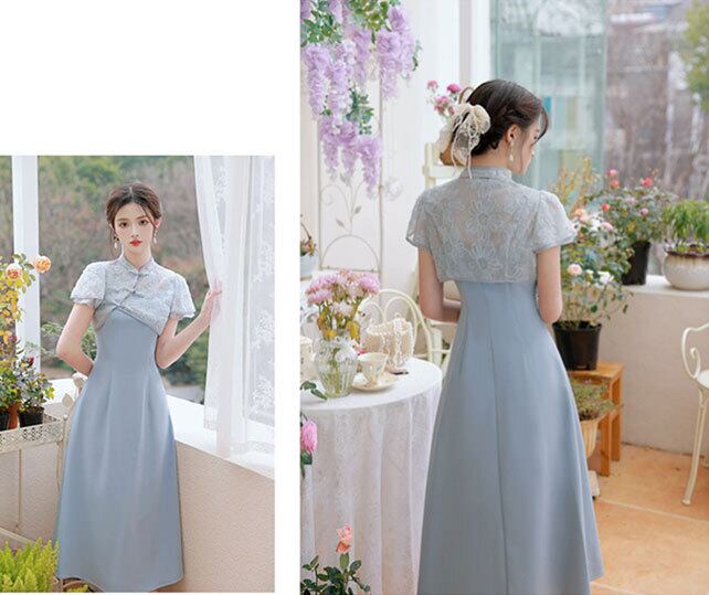 チャイナドレス ワンピース 上品な風合い 半袖 ブルー 花柄 セパレートセット zl370