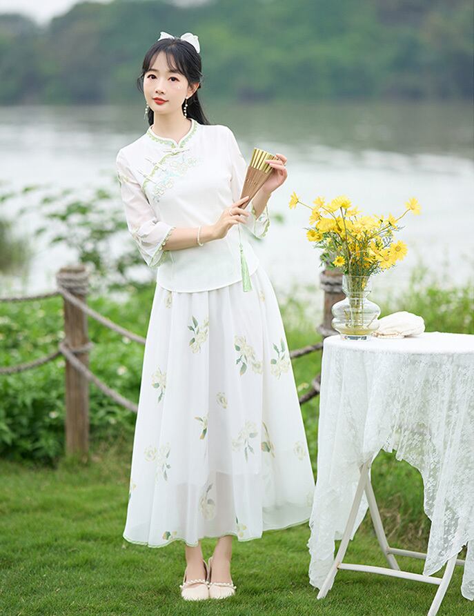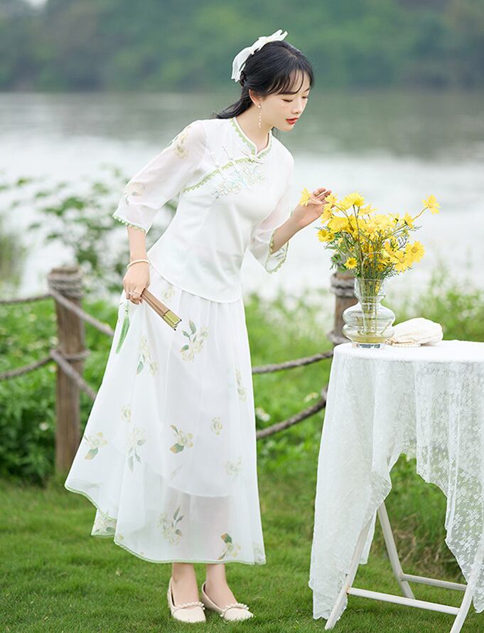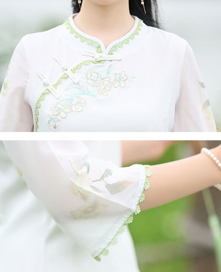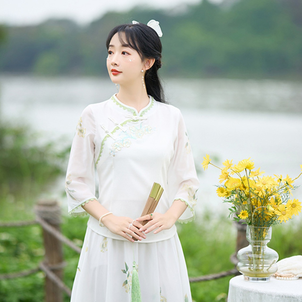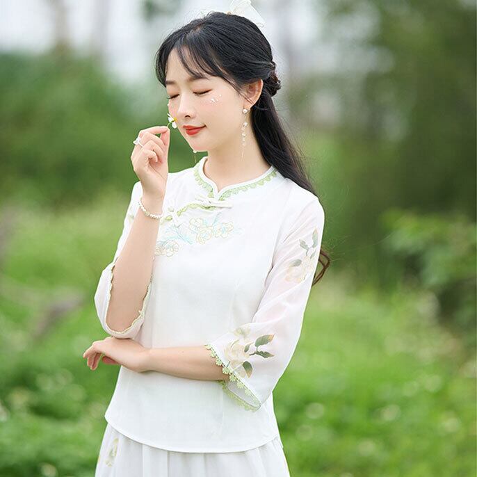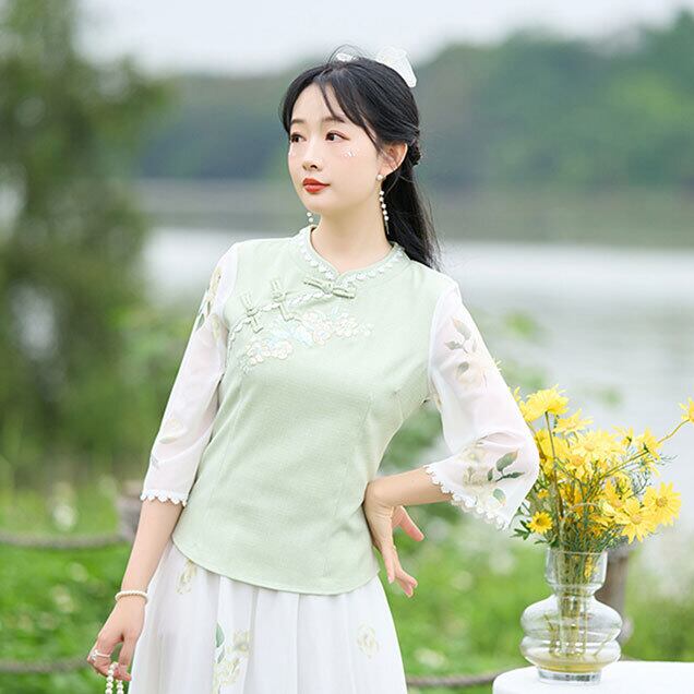チャイナ服 トップス 普段着 春夏 薄手 落ち着いた風合い サイド刺繍 五分袖 漢服 zh437