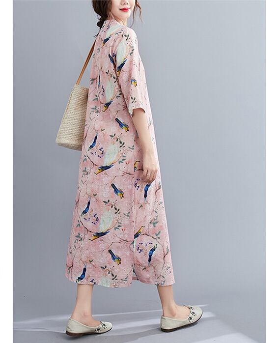 トップスも普段着も揃うチャイナ服専門店chaiです。こちらはチャイナ服 普段着 小鳥柄 ワンピース 五分袖 落ち着いた風合い zl382の商品ページです。すっぽりと着るゆったりとしたの素朴な小鳥柄ワンピースで、春夏の普段着にもちょうどよいアイテムです。