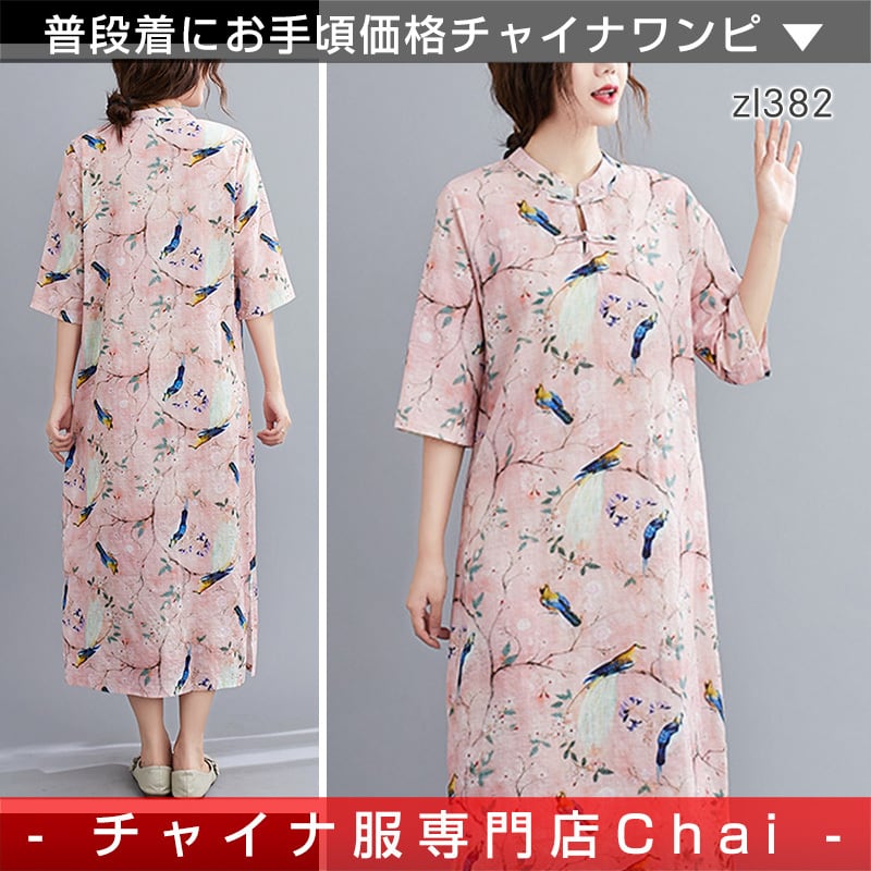 チャイナ服 普段着 小鳥柄 ワンピース 五分袖 落ち着いた風合い zl382