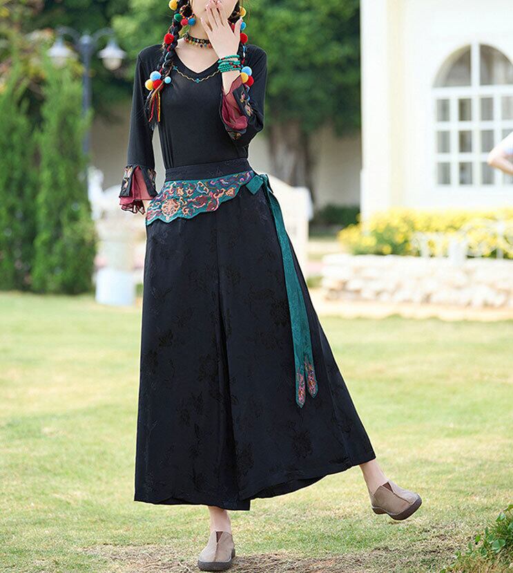 チャイナ服 パンツ 民族衣装風 刺繍 ワイドパンツ 普段着 ダンス衣装 舞踏 zb201