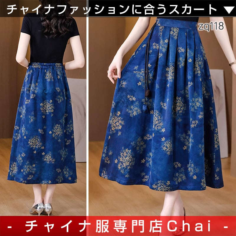 トップスも普段着も揃うチャイナ服専門店chaiです。こちらはチャイナ服 スカート 青 小花柄 上品な風合い Aライン ロング丈 zq118の商品ページです。上品な風合いのスカートで、チャイナトップスと合わせるのにぴったりのアイテムです。