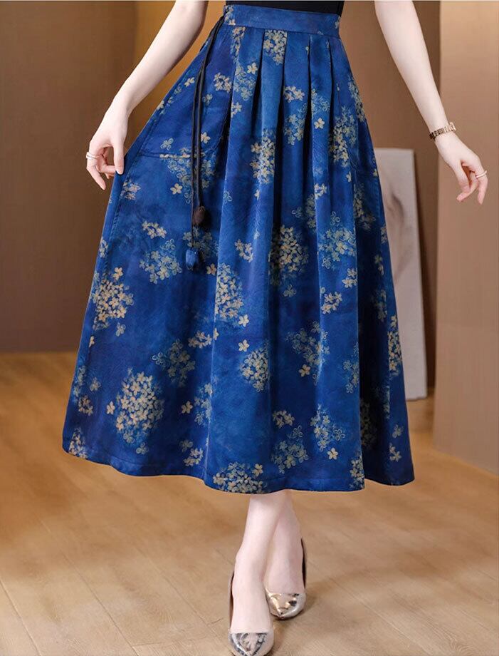 チャイナ服 スカート 青 小花柄 上品な風合い Aライン ロング丈 zq118