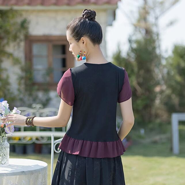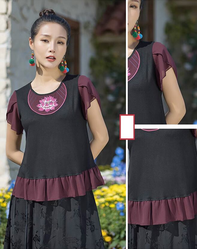 チャイナ服 トップス 春夏 半袖 フリル ワンポイント刺繍 チャイナシャツ zh452