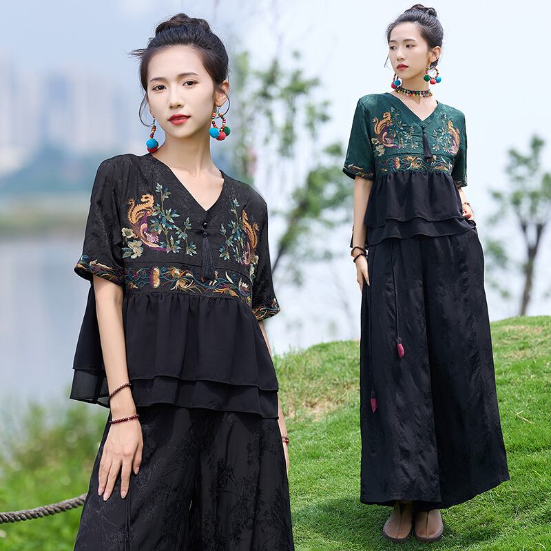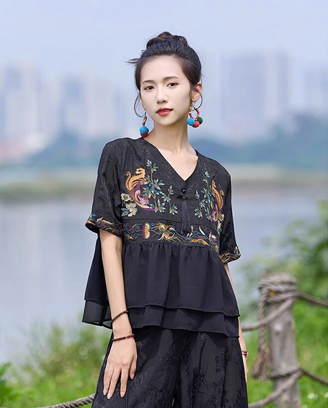 チャイナ服 トップス 春夏 薄手 刺繍 装飾トップス 半袖 Vネック zh454