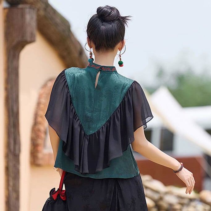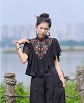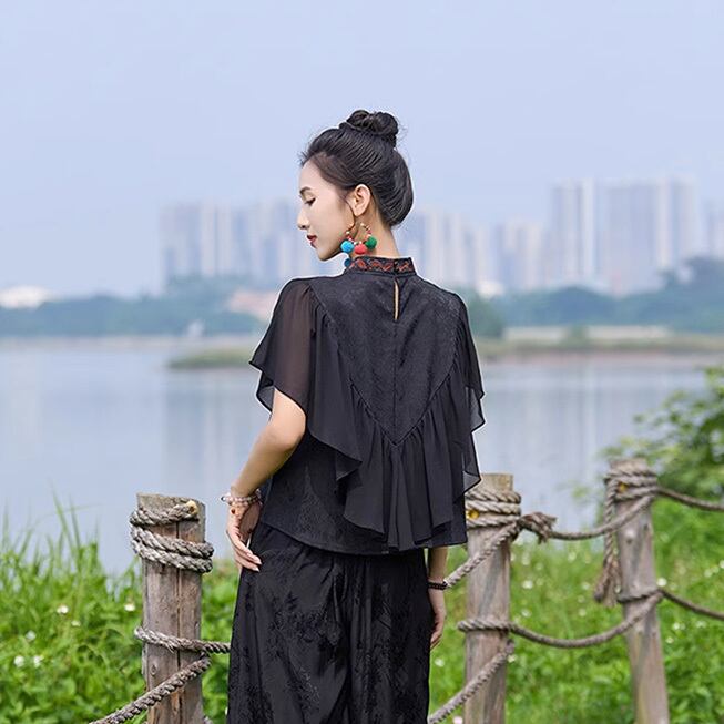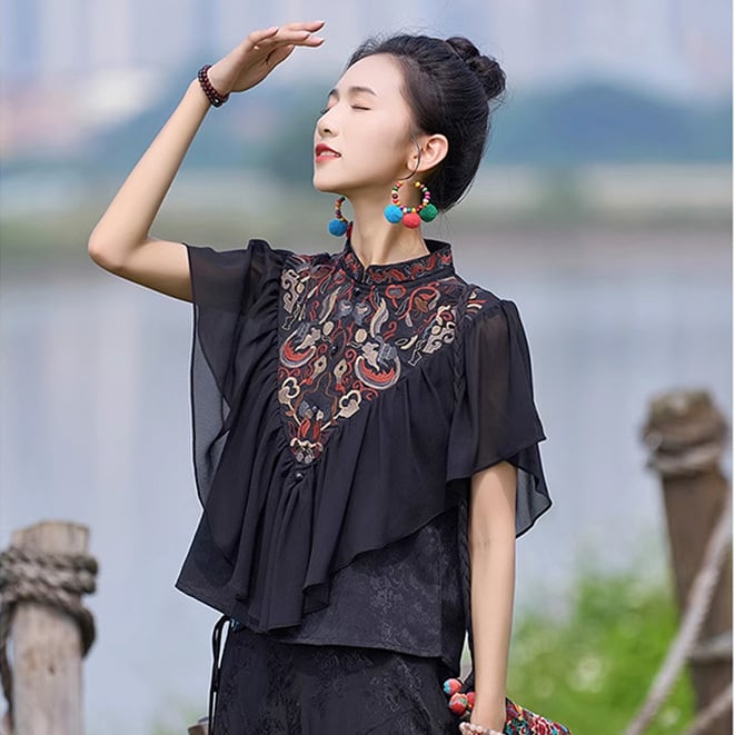 チャイナ服 トップス 春夏 薄手 刺繍 シフォン フリル装飾トップス zh455
