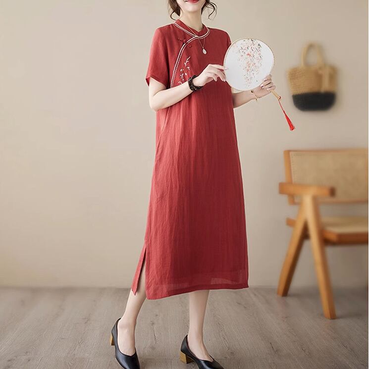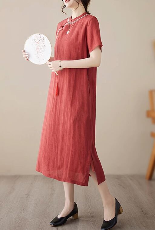 チャイナ服 普段着 ワンピース 落ち着いた風合い ゆったりシルエット レッド zl388
