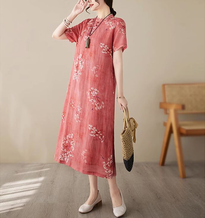 チャイナ服 ワンピース 春夏 ゆったりシルエット 素朴な風合い 半袖 花柄 zl397