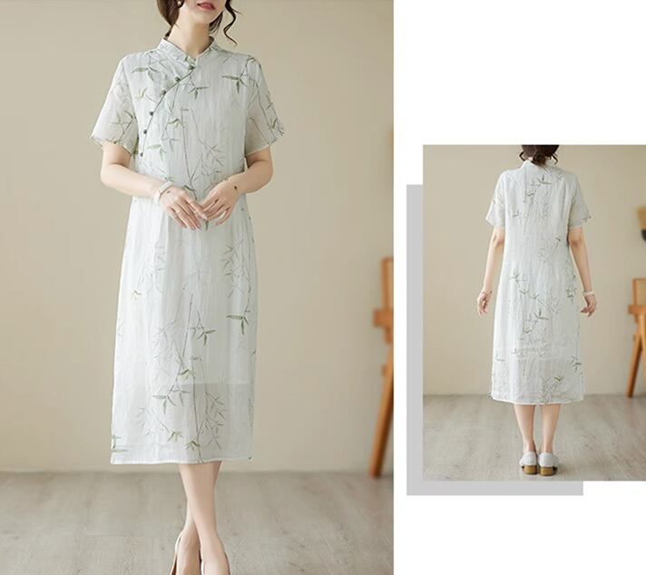チャイナ服 ワンピース 春夏 ゆったりシルエット 素朴な風合い 半袖 笹柄 zl399