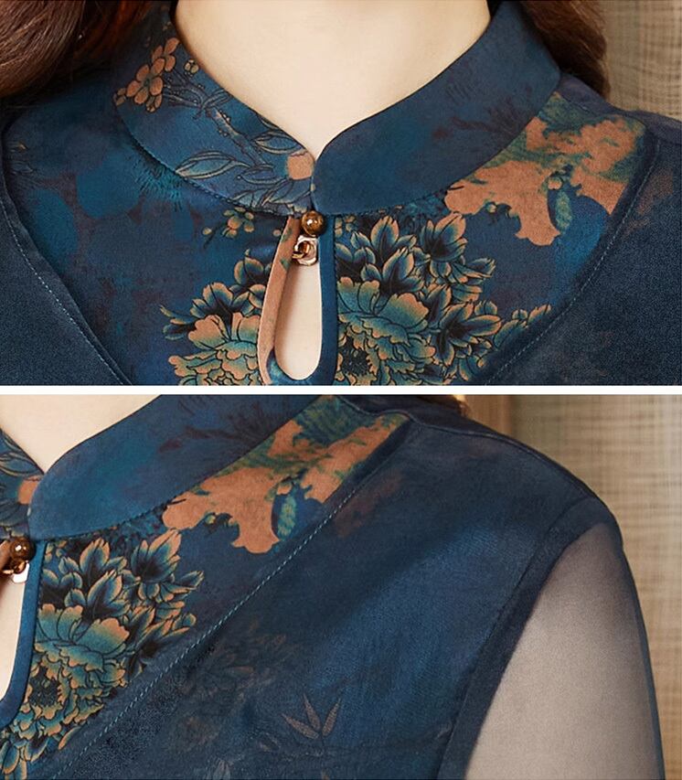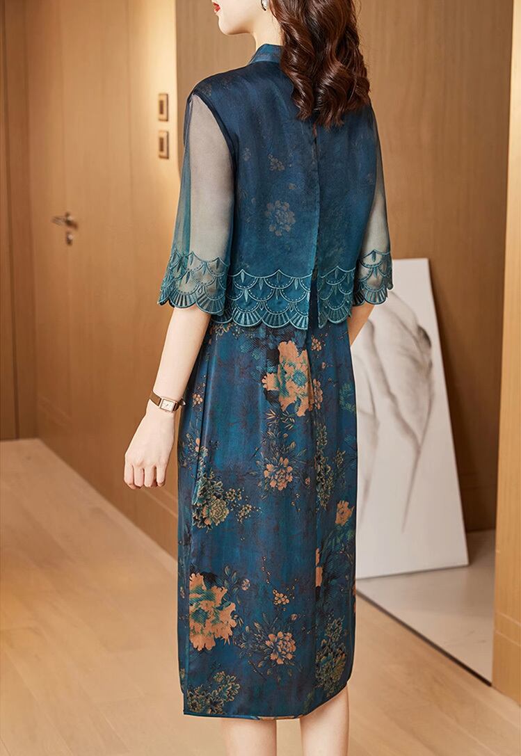 チャイナ服 ワンピース 透け感五分袖 レース 上品な風合い ブルー チャイナドレス zl401