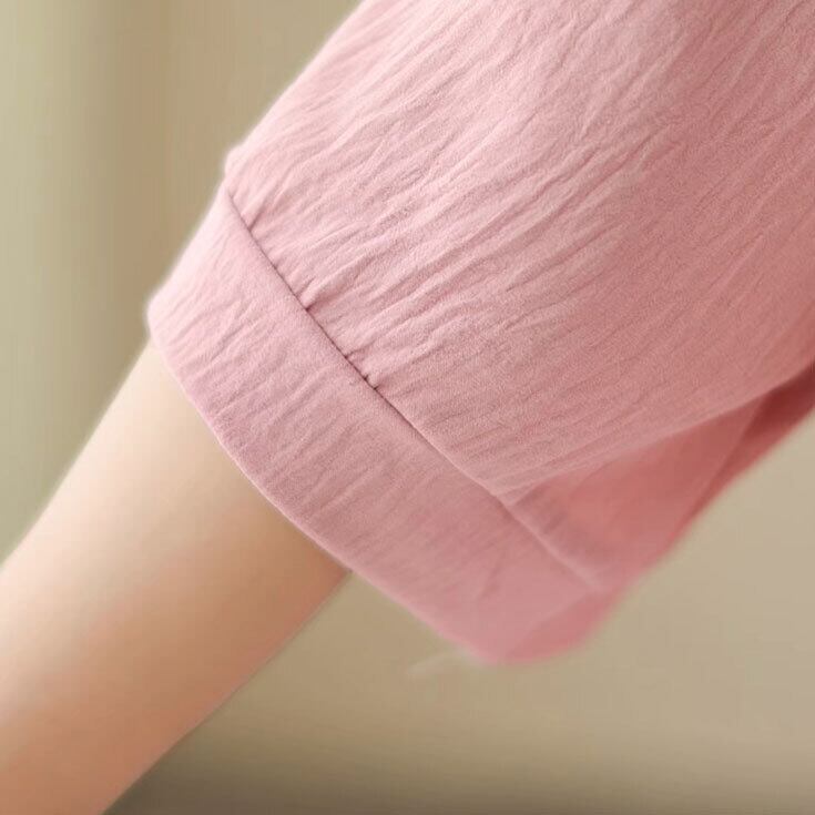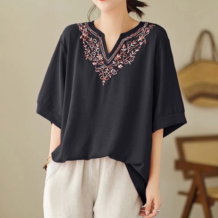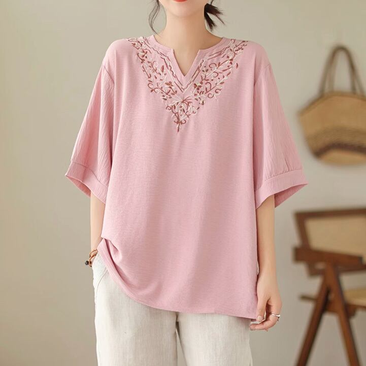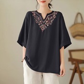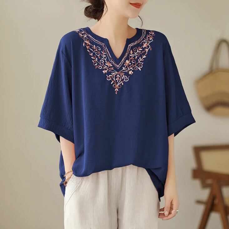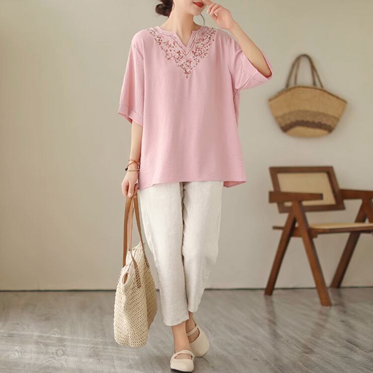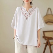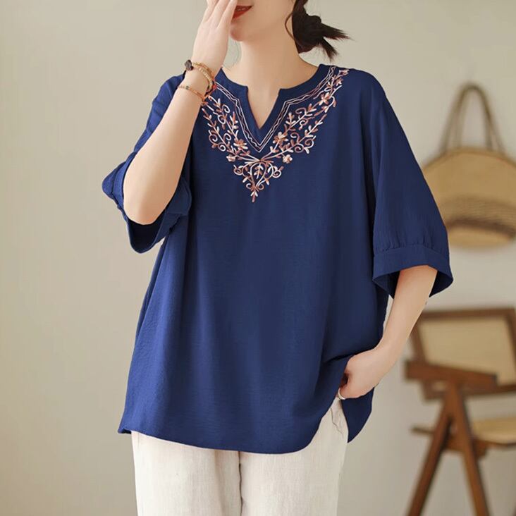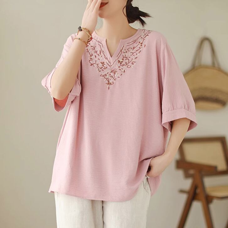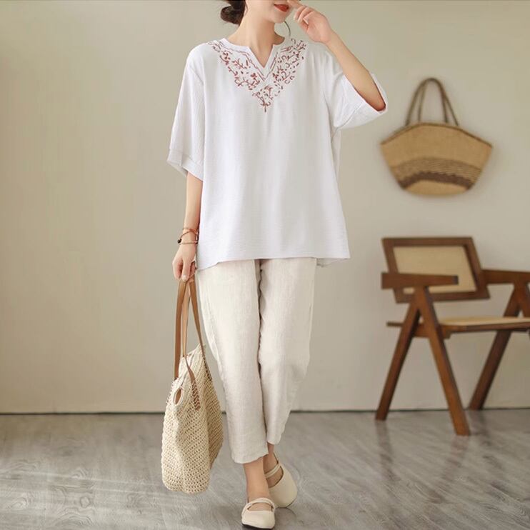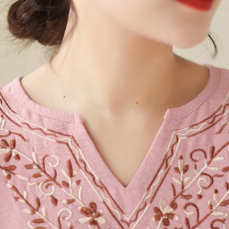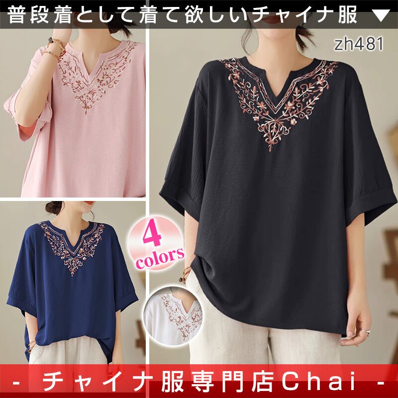 チャイナ服 トップス 五分袖 ゆったりシルエット 刺繍Vネック Tシャツ zh481
