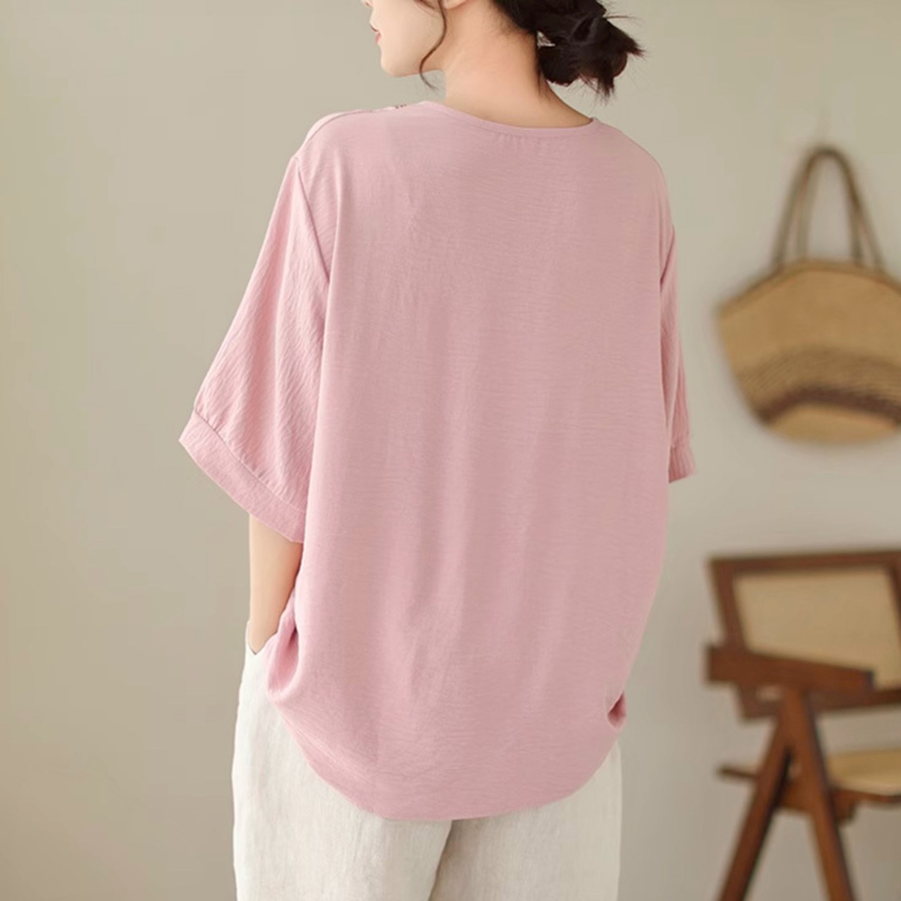 トップスも普段着も揃うチャイナ服専門店chaiです。こちらはチャイナ服 トップス 五分袖 ゆったりシルエット 刺繍Vネック Tシャツ zh481の商品ページです。シンプルな刺繍がかわいいチャイナトップスで、ゆったり普段着にちょうどいいアイテムです。