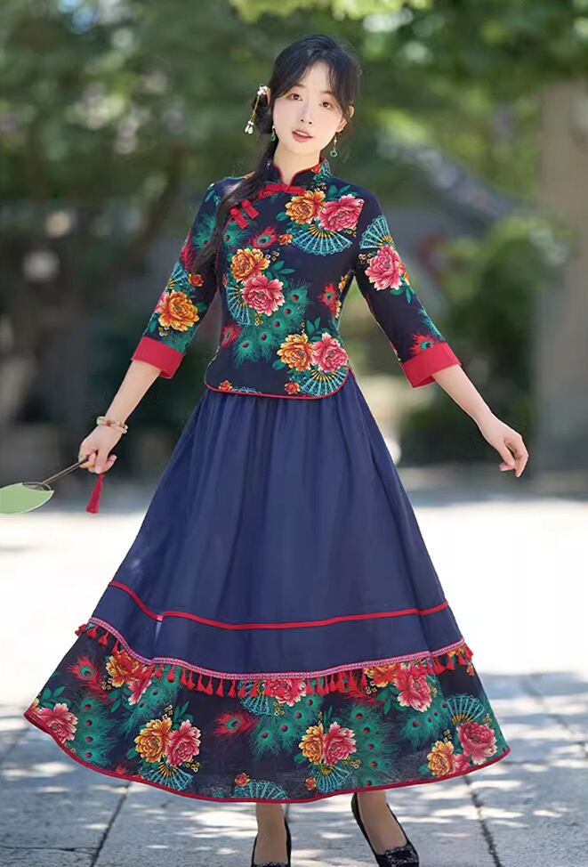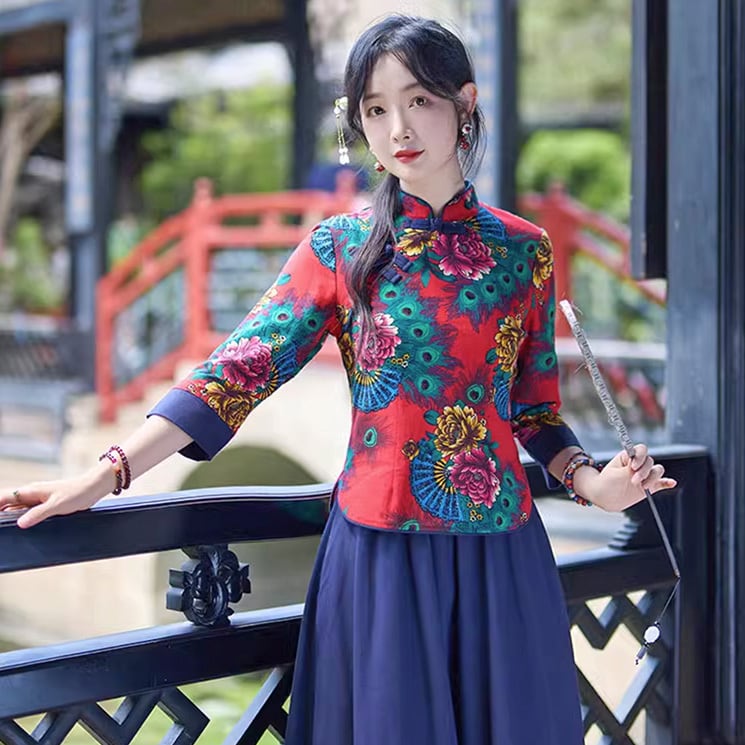 チャイナ服 トップス 春秋 七分袖 民族風 花柄 チャイナシャツ zt474
