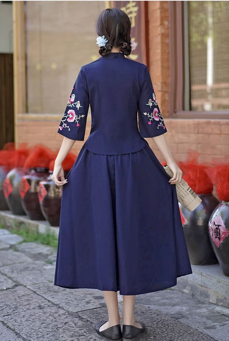 チャイナ服 トップス 春秋 落ち着いた風合い 刺繍 ゆったり袖 チャイナシャツ (スカートも注文可) zh490