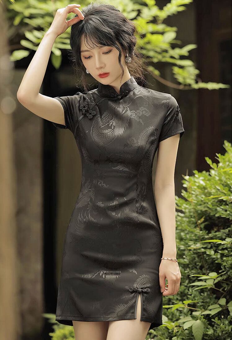 チャイナドレス チャイナ服 ワンピース ブラック モダン 龍柄 ショート丈 zs256