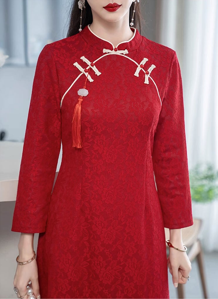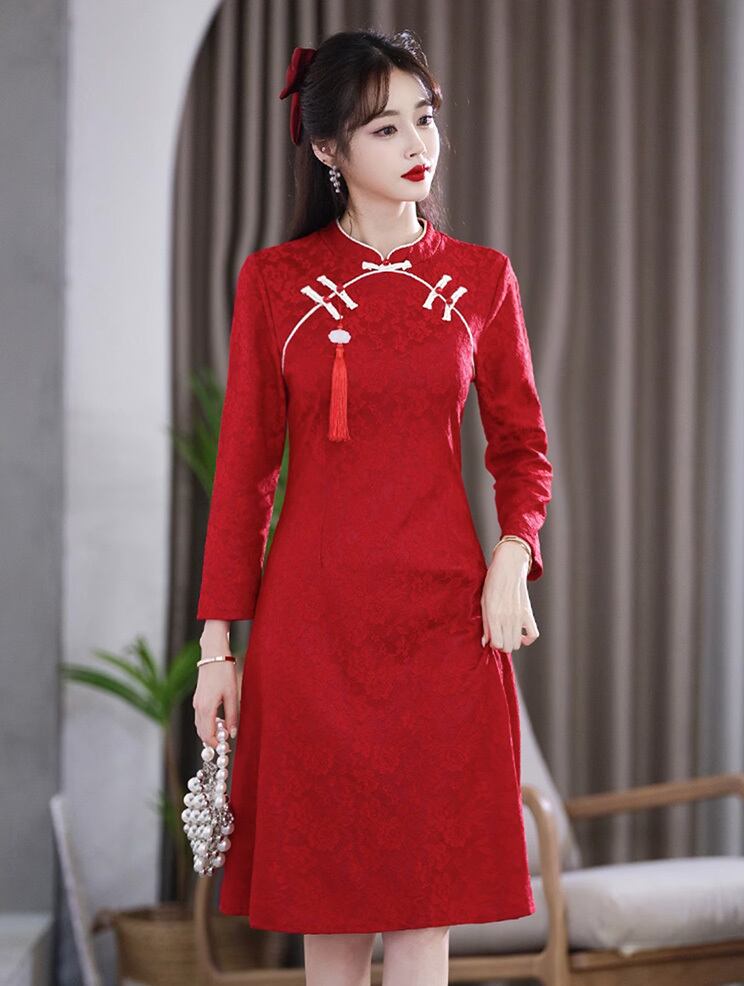チャイナドレス チャイナ服 ワンピース レッド ひざ丈 長袖 旗袍 zs257