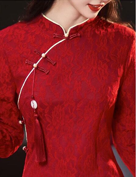チャイナドレス チャイナ服 ワンピース レッド ロング丈 長袖 旗袍 パーティードレス zl403
