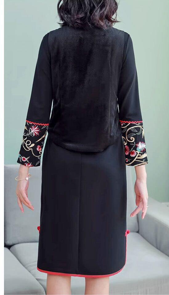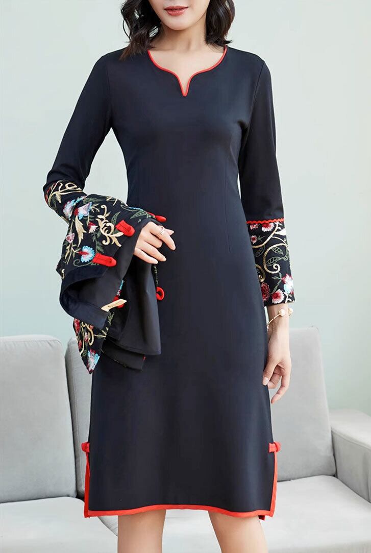 チャイナ服 ワンピース レッド ひざ丈 刺繍 長袖 チャイナドレス zs260