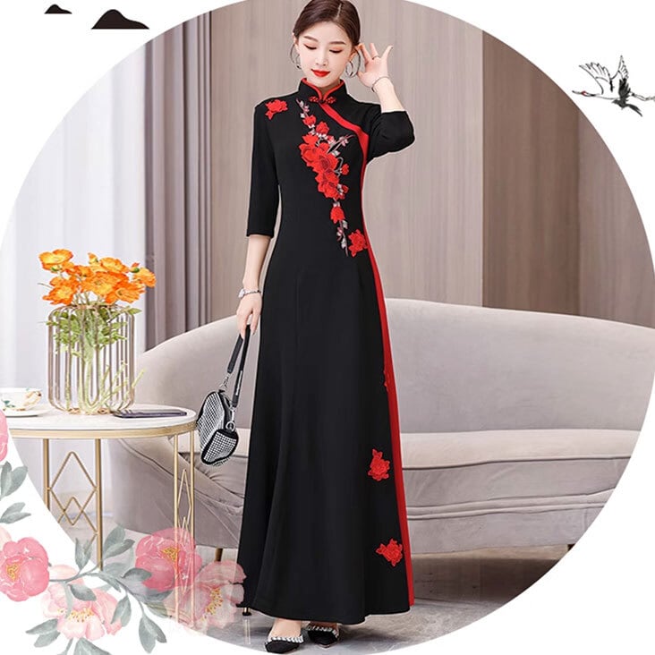 チャイナドレス ロングワンピ ステージ衣装 上品な風合い 七分袖 刺繍(縫い付け) zl407